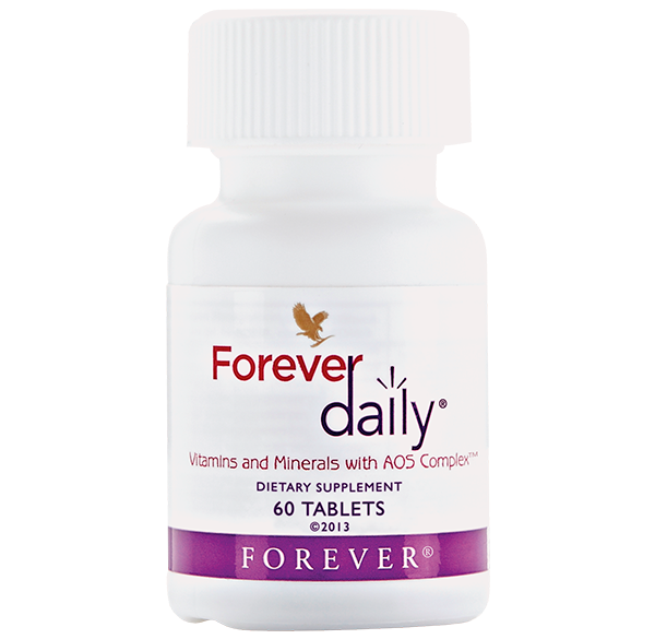 Αυτή η καθημερινή πολυβιταμίνη παρέχει το 100% της συνιστώμενης ημερήσιας δόσης (ΣΗΔ) βασικών βιταμινών και βιοδιαθέσιμων μετάλλων και θρεπτικών συστατικών. Το Forever Daily συνδυάζει πενήντα πέντε τέλεια ισορροπημένα θρεπτικά συστατικά με αλόη, συμπεριλαμβανομένων των βιταμινών A, C, D και B12, του σιδήρου, του ασβεστίου και του ψευδαργύρου. Μπορείτε να το λάβετε μαζί με το Χυμό Forever Aloe Vera Gel για καλύτερα αποτελέσματα.